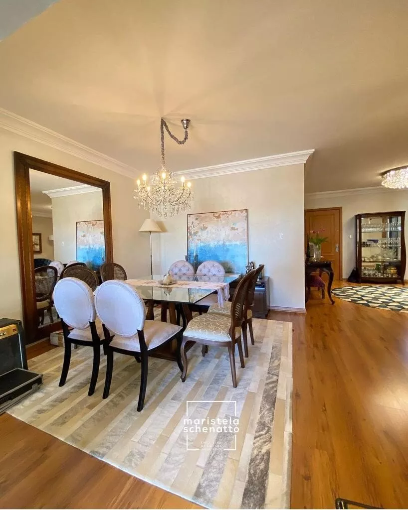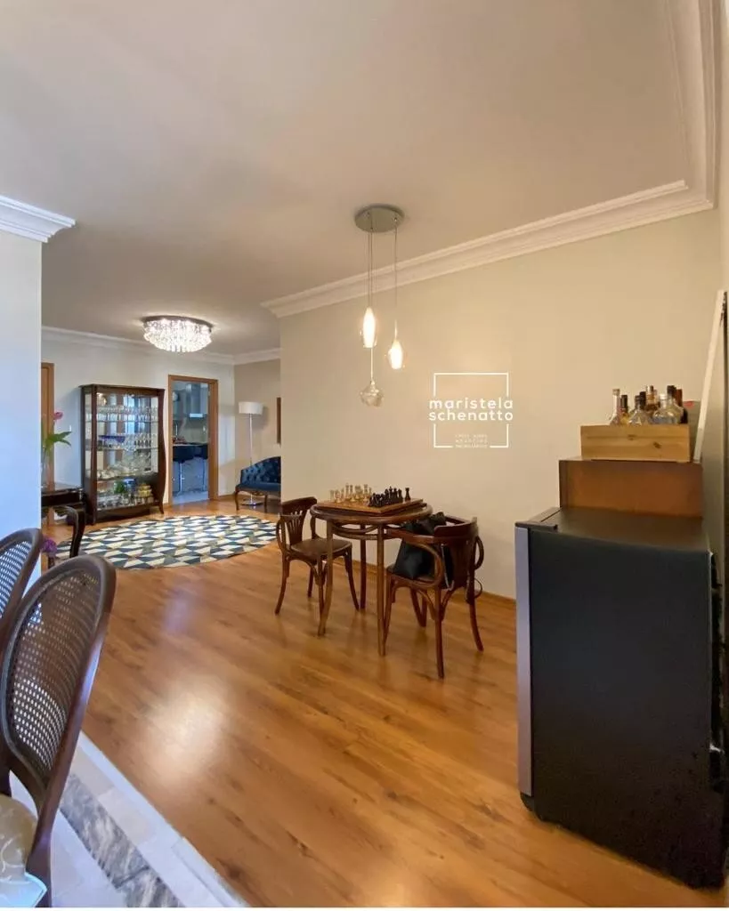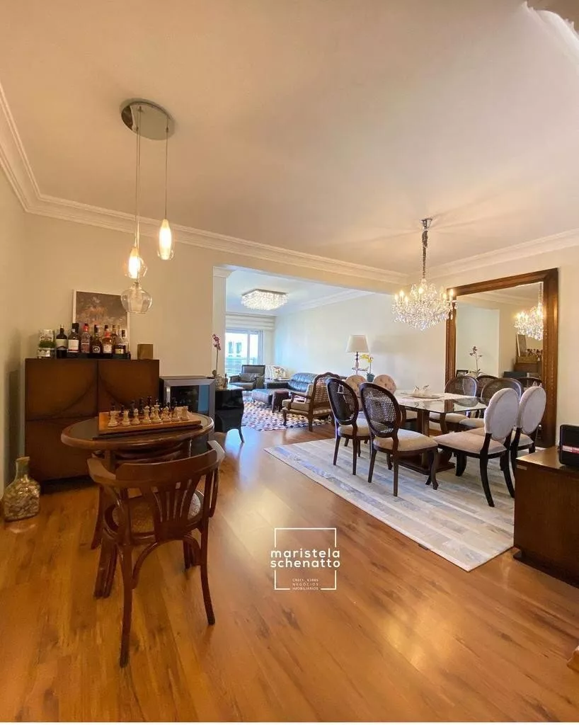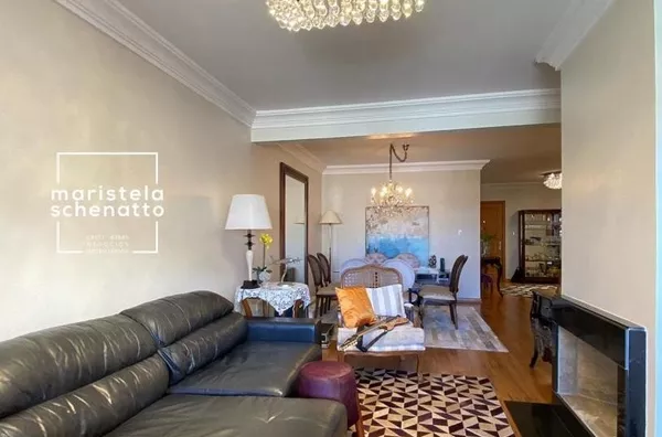 Apartamento com ampla área de entrada e sala integrada, que, no momento, está composta com uma sala de jantar, sala de estar/tv com lareira e um espaço para um pequeno bar e mesa de jogos.